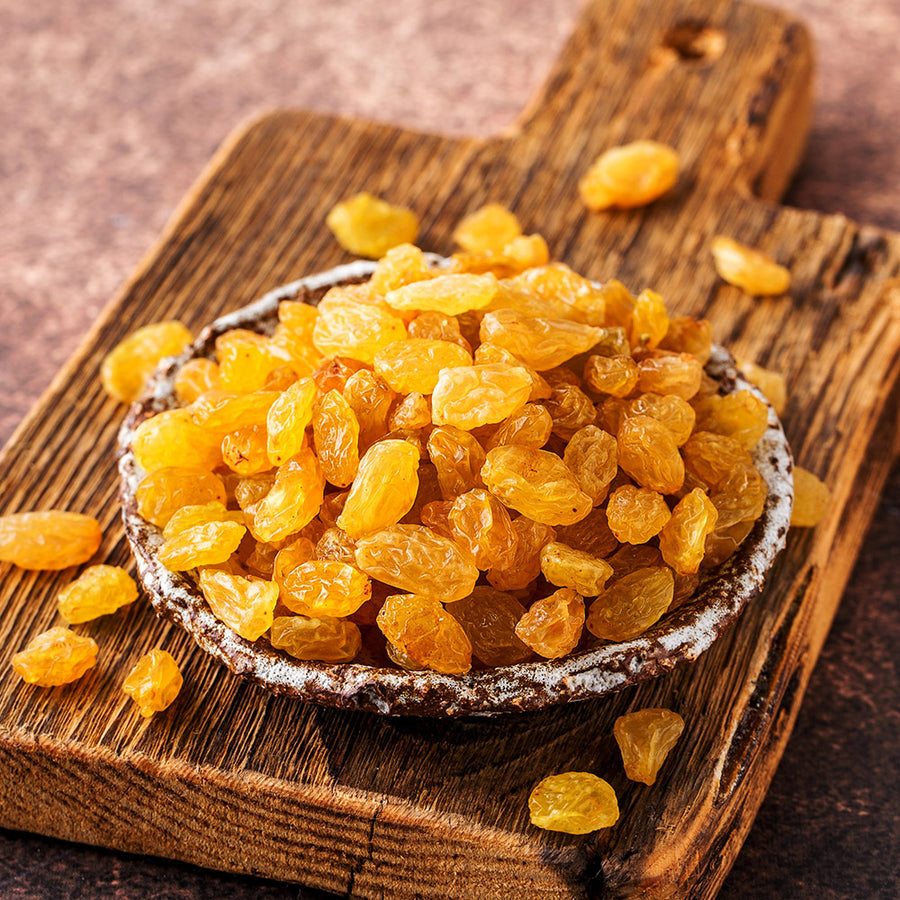 Golden Raisins are green Thompson seedless grapes that are oven dried instead of Sun dried to avoid the darkening effects of sunlight. Raisins and grapes are the only common foods known to contain both natural tartaric acid and fiber. Raisins are a great source of phenolics and essential trace minerals including K, Ph, Ca, Mg, Na, Fe, Mn, Cu, Zn in addition to vitamins A,B and C