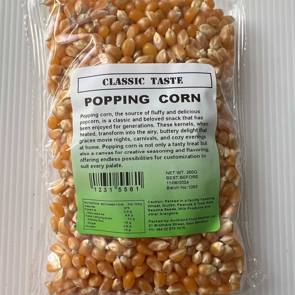 Ingredients:- Premium N.Z. Yellow Pearl Popping Corn Kernels (microwaveable). Popcorn is a great and tasty snack, a real alternative to sugary sweets. It is low in calories and fat and rich in carbohydrates. It is 95% popping, if stored correctly, but if they have insufficient water within the starch to create the build up of pressure needed to pop the kernels, popcorn can't pop. (13.5 to 14 percent per kernel is needed).
