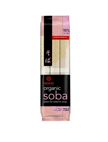 Hakubaku Organic Soba is made of wheat flour and buckwheat flour. These brown and thin authentic Japanese noodles have a chewy and grainy texture with a refreshing taste.